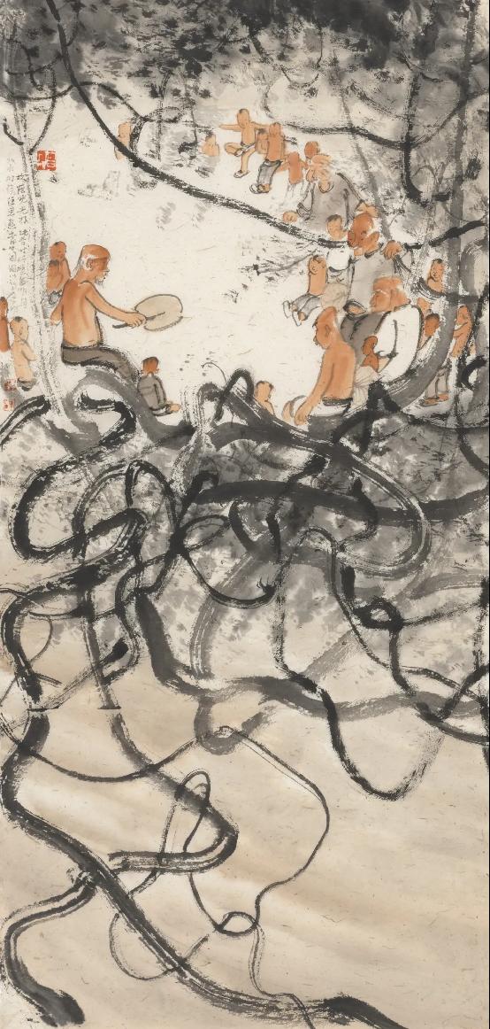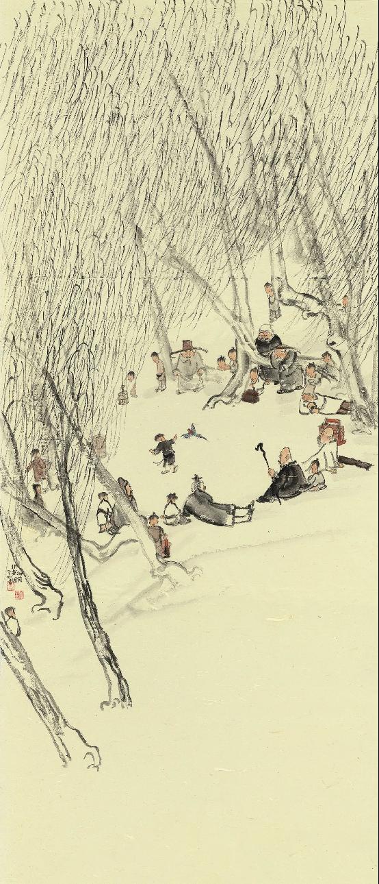 李学明《柳荫行乐》 纸本设色 200cm×90cm 2020年