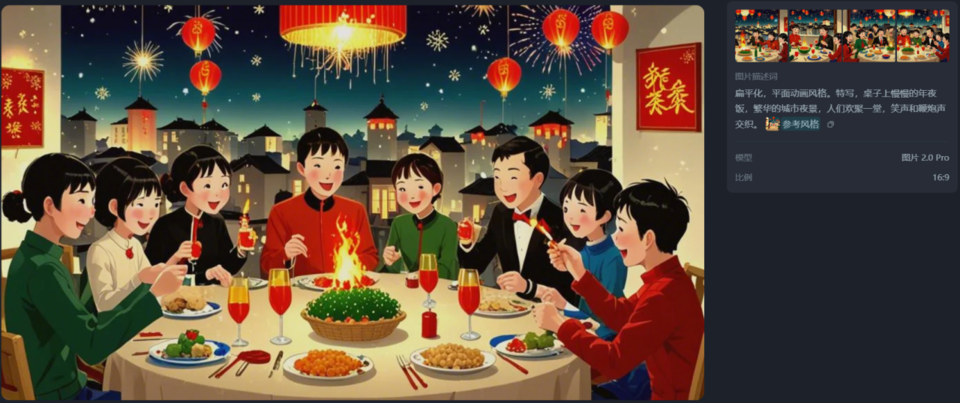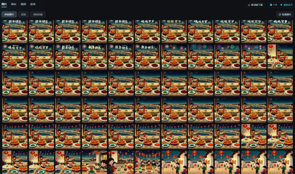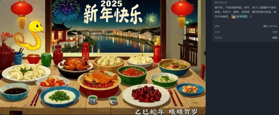 闫景林给我们展示了贺岁片中开头和结尾都出现过的一个年夜饭画面,她说光是针对这一个画面的生成就进行了86次的训练,先是根据第1次的画面反馈修改部分提示词,再到局部修改桌子上的每一盘菜,最后添加上想要的文字,这其中需要不断的尝试和耐心,让人工智能的输出画面越来越贴合心中想要的效果,从第1张到第86张,我们都能感受出天壤之别。