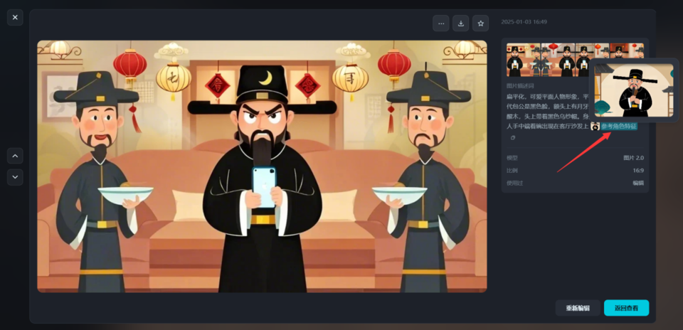 关于贺岁动画的具体制作过程,闫同学这样说“包公新春贺岁片的画面生成也全部使用即梦软件进行完成,主要步骤大体是“文生图(选择参考风格)—得到图片—进行局部修改与描述—得到新图片—细节修复—提升清晰度—新图片生视频”,针对平面动画的制作,人工智能技术的介入确实大大提高了工作效率、节省了很多成本,但是实际操作情况也并没有许多人想象的那么简单,比如在对图片进行局部修改时经常需要训练几十次结果才能得到一个自己满意的画面,再把这一个画面作为视频首帧结合一定的文本描述生成视频时,也往往存在很多不可控的情况,需要反反复复尝试和训练。”