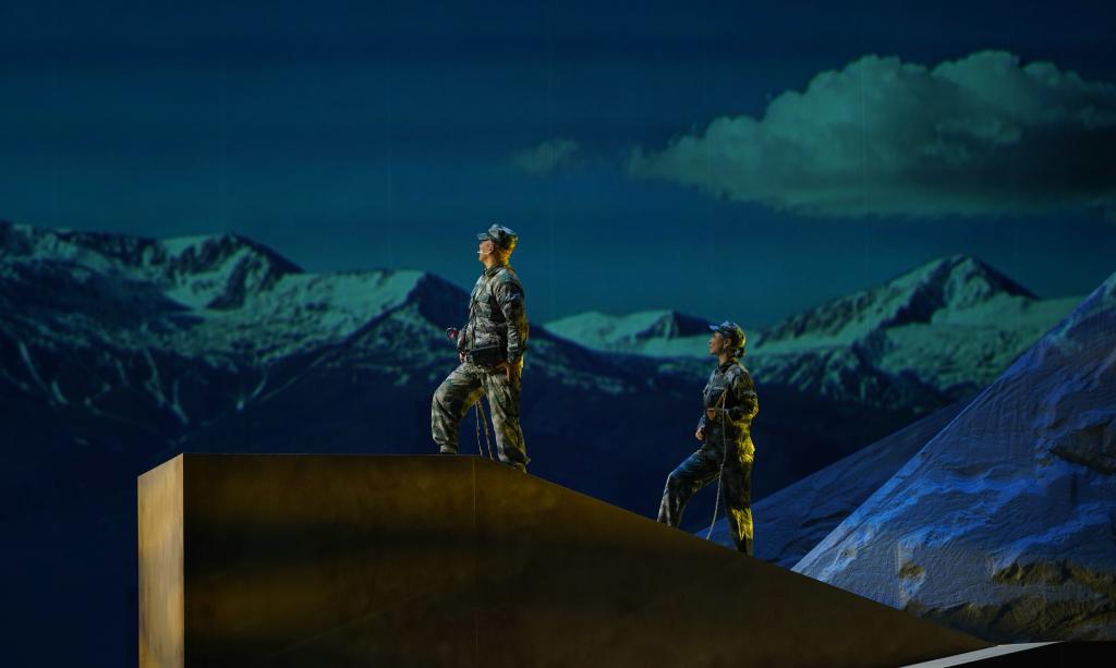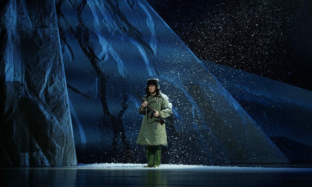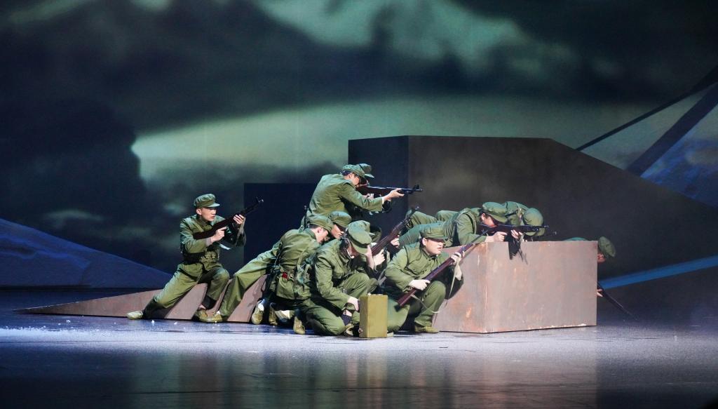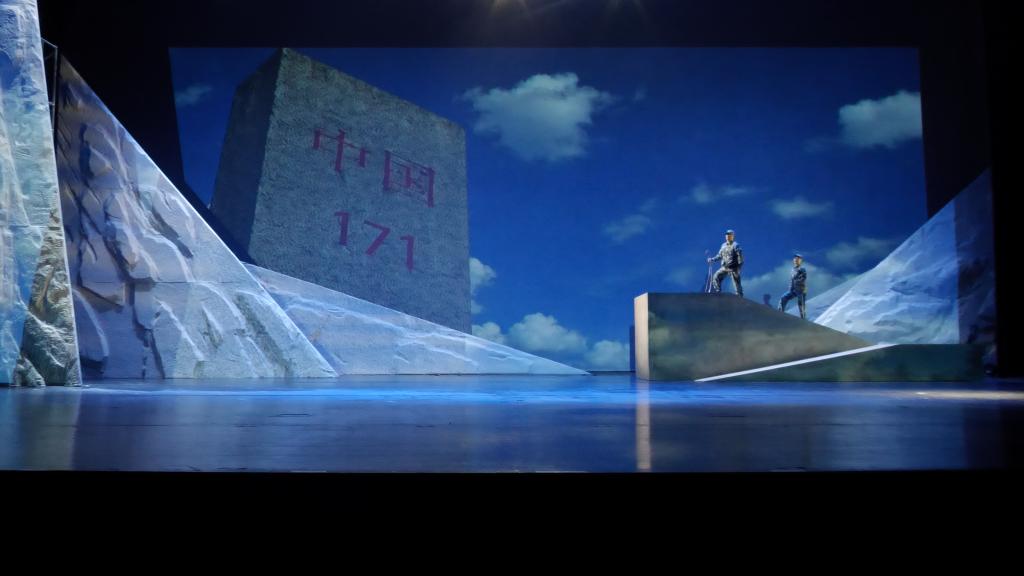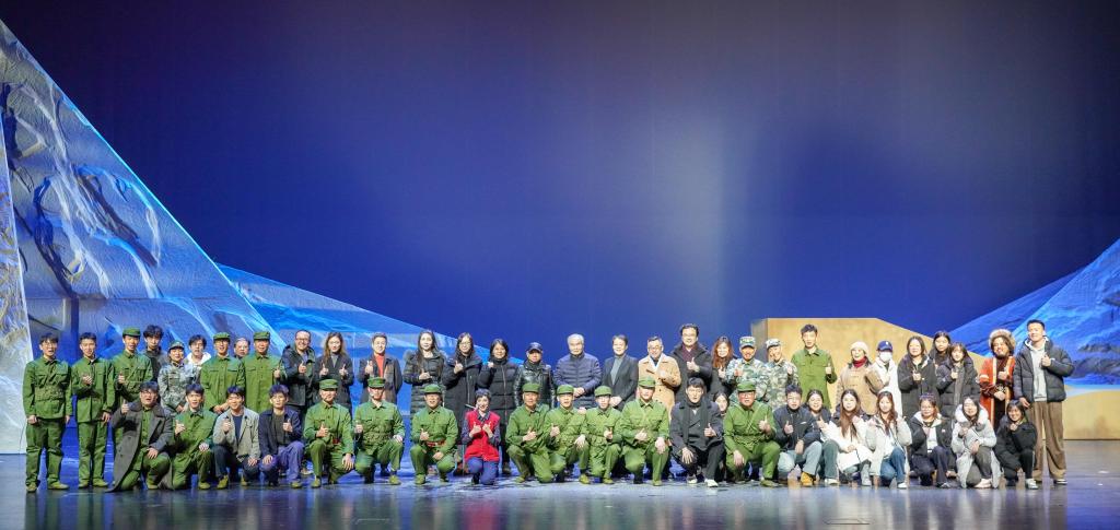 《中国界碑》主人公原型为“七一勋章”获得者、“感动中国”人物、全国道德模范、全国模范退役军人、“最美奋斗者”、新疆生产建设兵团第九师161团第一代护边员、山东省临沂籍老兵、84岁的魏德友老人。剧目讲述了两位兵团老兵自1964年起扎根中国和哈萨克斯坦边境最前线,把家安在两道边防铁丝网之间,在周围50公里荒无人烟的萨尔布拉克草原坚定驻守60年,巡边总里程20万公里的生命历程。该剧由我校“青创团队”负责人、产教融合青岛基地电影产业学院教师孙丽萍担任编剧,青岛基地教师邵鹏、刘柳分别担任导演和舞美设计,工业设计学院教师杜春晓担任灯光设计,团队校外成员赵晓凯担任音效设计。团队成员于2023年4月赴新疆中哈边境对主人公原型魏德友进行了深入采访,2024年5月完成剧本创作,12月完成舞台创作。剧目参演演员30人,演出时长140 分钟。