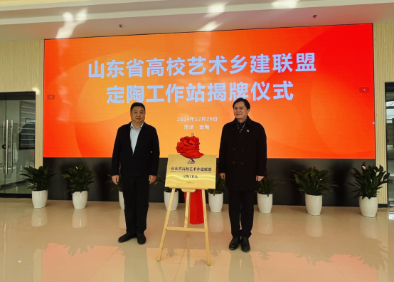 开幕式上,我校合作发展处处长、工业设计学院院长张焱与定陶区政府党组成员、副区长王军华共同为“山东省高校艺术乡建联盟”定陶工作站揭牌。