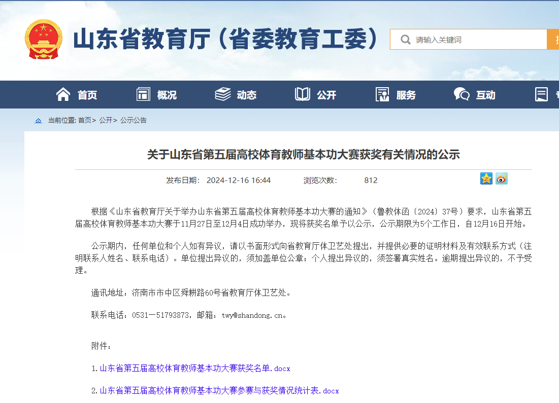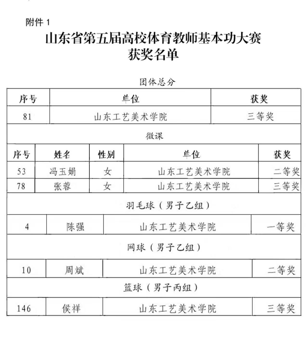 近日,由山东省教育厅举办的山东省第五届高校体育教师基本功大赛公示了比赛结果。我校教师获一等奖1项,二等奖2项,三等奖2项,获得团体三等奖,这是我校近年来在此项赛事中获得的最好成绩。