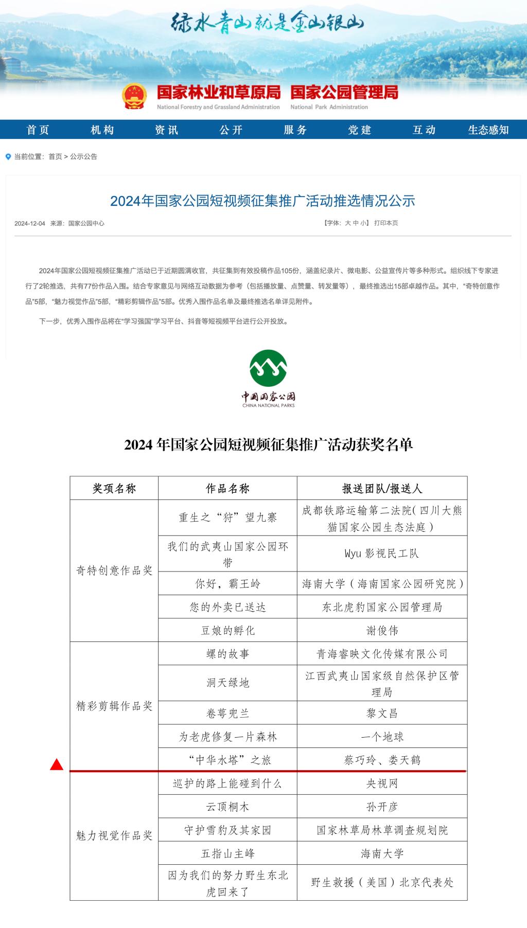由国家林业和草原局国家公园(自然保护地)发展中心主办的2024年国家公园短视频征集推广活动于本月圆满收官。我校视觉传达设计学院推送的蔡巧玲、娄天鹤作品《“中华水塔”之旅》荣获“精彩剪辑作品奖”。