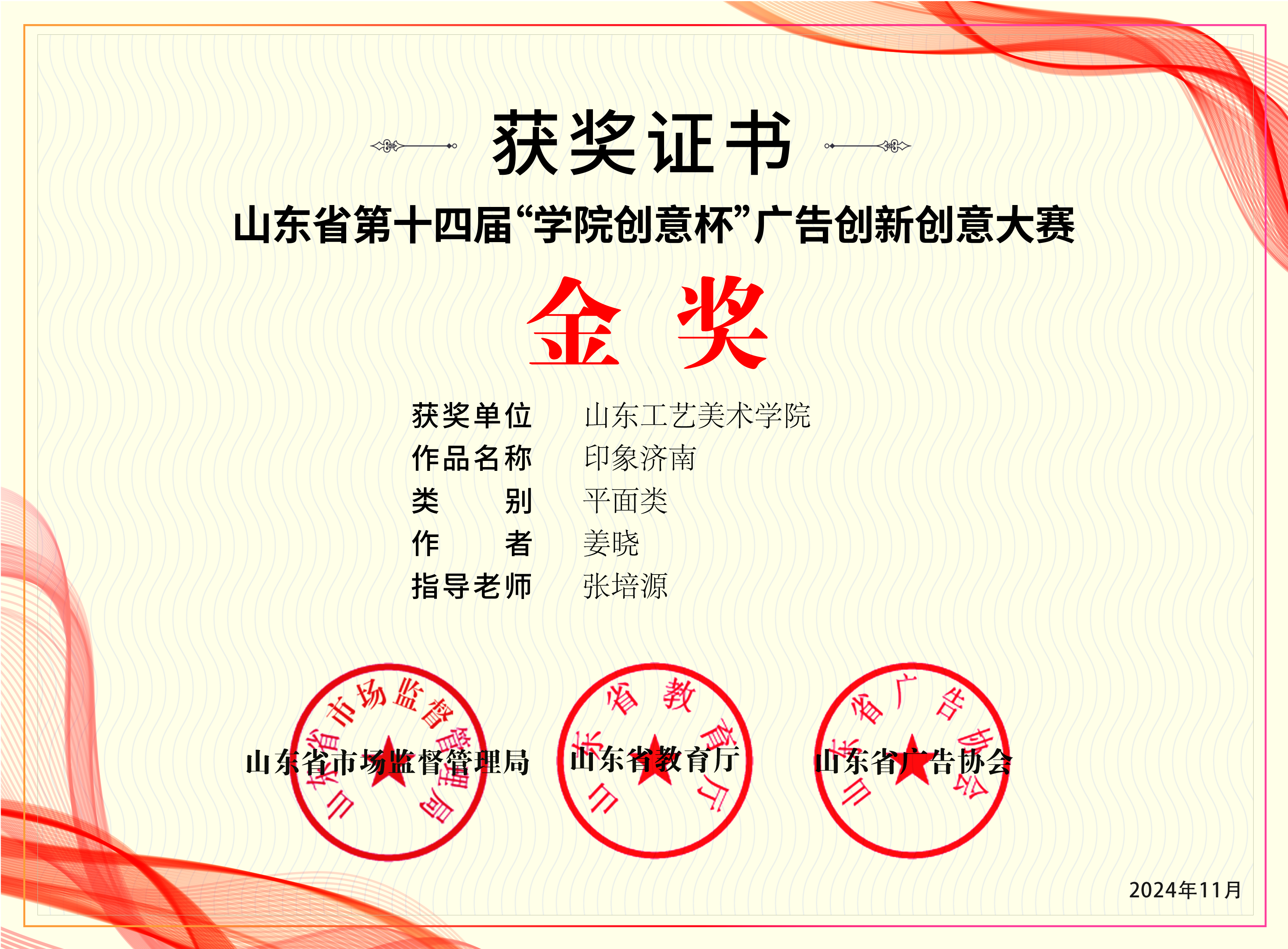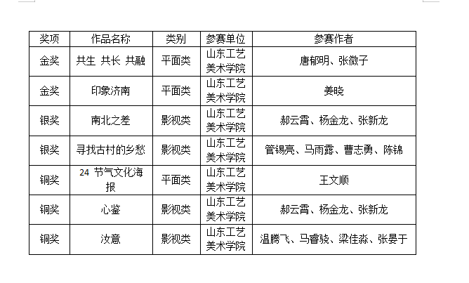 近日,山东省2024年公益广告创新创意大赛暨山东省第十四届“学院创意杯”颁奖典礼在山东艺术学院隆重举行。学校师生作品《共生共长共融》《印象济南》荣获一等奖;《南北之差》《寻找古村的乡愁》荣获二等奖;《24 节气文化海报》《心鉴》《汝意》荣获三等奖,学校获得"优秀组织单位"。