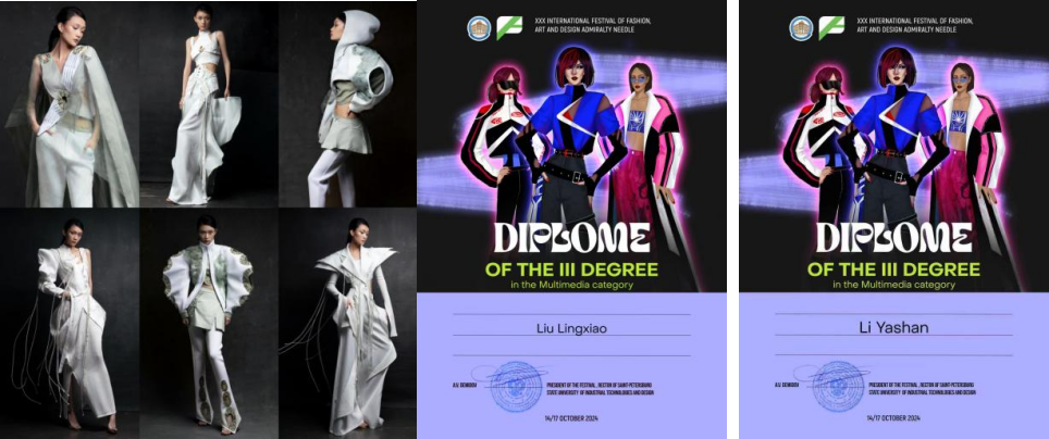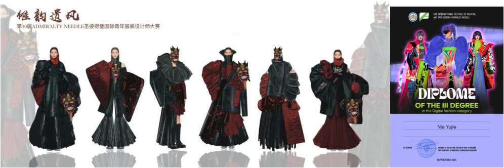 近日,第30届Admiralty Needle圣彼得堡国际青年设计师大赛(The 30th International Young Designers Contest Admiralty Needle)在俄罗斯圣彼得堡举办。我校服装学院学生聂玉洁的作品《傩韵遗风》获Digital Fashion(数字时尚)组季军,刘凌霄、李亚珊的作品《皎玉》获Multimedia(多媒体)组季军。
