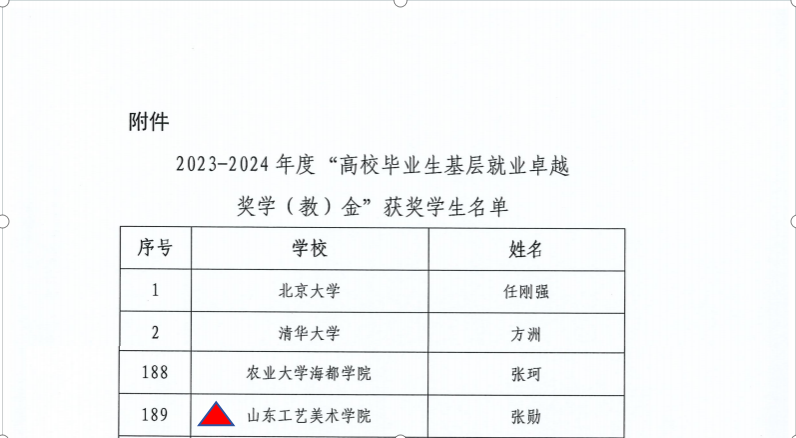 近日,由教育部高校学生司(高校毕业生就业服务司)和教育部学生服务与素质发展中心共同指导、中国教育发展基金会设立的“高校毕业生基层就业卓越奖学(教)金”2023-2024年度获奖名单公布,我校2015届数字艺术与传媒学院优秀毕业生张勋获此殊荣,实现了学校在这一奖项上的历史性突破。