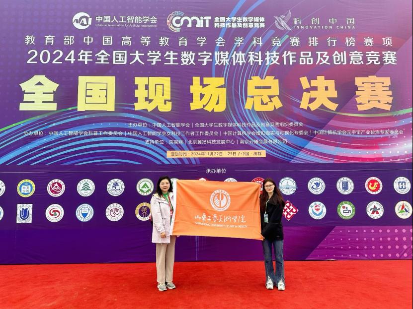 全国总决赛在成都市科幻馆雨果厅、太阳厅同步举行,97位评审专家对21个赛道的1500余组作品进行评审,最终评选出今年全国总决赛所设立的各类奖项。学校教务处处长顾群业、数字艺术与传媒学院副院长张光帅、新媒体艺术专业教师姜军、李明宇作为本次比赛指导老师,数字媒体艺术专业教研室主任牟堂娟老师带领参赛学生黄亚楠在总决赛现场答辩中脱颖而出,荣获国赛二等奖,李艳欣、范晓杰、杨琳茜、郝逸澄、王旭、刘文慧获得国赛三等奖。