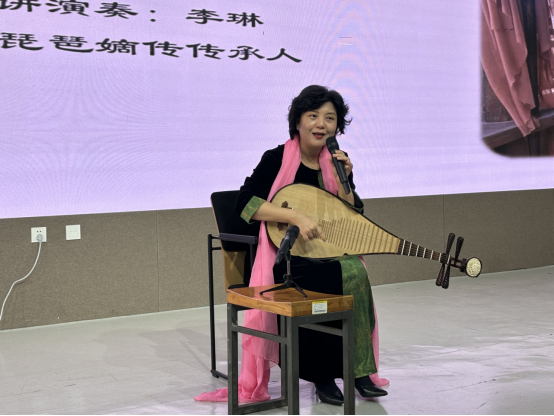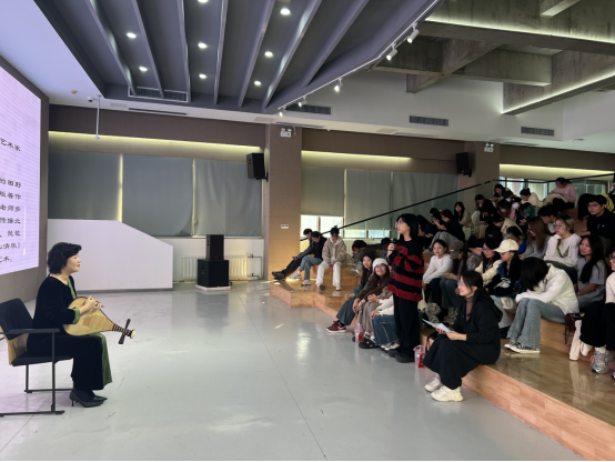 本次课程邀请到了北派琵琶嫡传传承人李琳老师。李琳老师边讲边弹,讲演结合,向同学们介绍了具有两千多年历史的琵琶的渊源及特征、琵琶流派发展脉络、琵琶演奏与哲学的密切联系以及北派琵琶传承的意义。分别演奏了《春江花月夜》《秋声》《十面埋伏》等琵琶经典名曲,并按照不同地域演奏了风格鲜明的民族歌曲,如山东民歌《沂蒙山小调》、江南民歌《茉莉花》、新疆民歌《青春舞曲》等,还演奏了大家喜爱的现代歌曲《兰亭序》《女儿情》等,余音绕梁,婉转悠扬。在师生互动环节,李琳老师邀请23级视觉传达设计学院智能交互设计班李佳雨同学上台朗诵诗歌《春江花月夜》,并为之伴奏,现场气氛十分热烈。