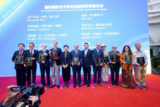 白玉刚、赵少华为获得国际摄影艺术终身成就奖的摄影家里卡尔多·布西、约安尼斯·利库里斯、弗雷德·瓦·吉尔伯格、赫伯特·吉米尼、郑培书、汤姆·昂、曼努车尔·德哈提、阿加莎·布南塔、杨元惺、陈缺颁奖。