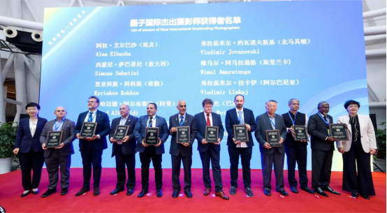 孙晓筠、王晓娟为获得墨子国际杰出摄影师的摄影家阿拉·艾尔巴沙、西蒙尼·萨巴蒂尼、里亚科斯·科科斯、艾哈迈德·阿尔布赛迪、埃米尔·博兹纳尔、弗拉基米尔·约瓦诺夫斯基、维马尔·阿马拉通格、弗拉基米尔·拉卡伊、王卫光、悉达多·森颁奖。