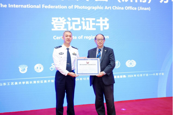 山东省公安厅境外非政府组织管理办公室处长张联巍为曾毅颁发国际摄联中国(济南)办事处登记证书。