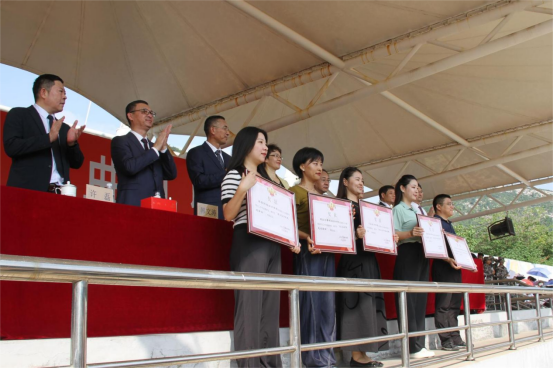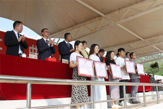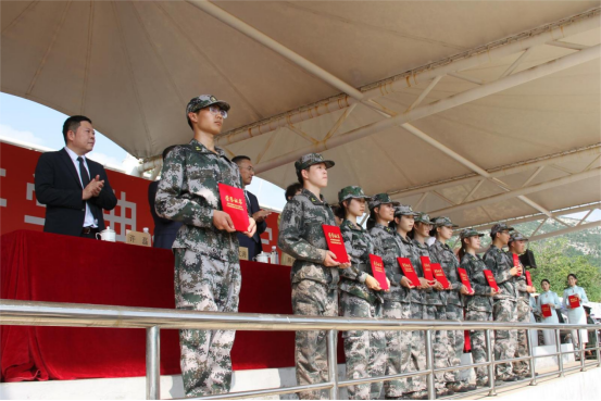 韩世春宣读学校表彰决定。出席典礼的校领导为军训工作先进集体、个人颁发奖状与荣誉证书。