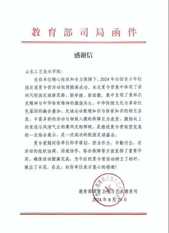 近日,教育部体育卫生与艺术教育司致信,对学校在2024年全国青少年校园足球夏令营中的表现提出表扬。