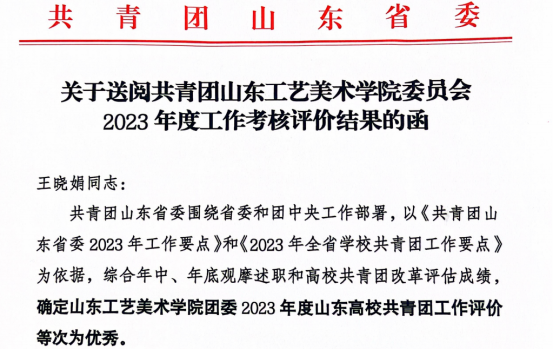 近日,共青团山东省委向学校致函,公布2023年度山东高校共青团工作考核评价结果,并对学校党委给予共青团工作的关心和支持表示感谢,我校在此次考核中获评“优秀”等次。