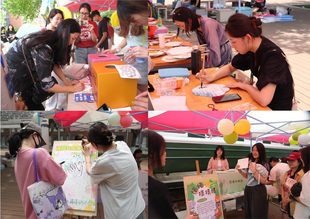 以美润心,以心向美。心理健康教育中心承办的“浮光流淌,让爱流转”创意漆扇体验活动受到热烈反响,引导学生在创作中探寻自我,疗愈自我。服装学院承办的“‘签’手你我 向阳而生”书签设计大赛,激发学生探索传统文化与创意融合的无限可能。“‘盒’你倾诉,共情祝福”游戏引导学生学会倾听他人的声音,释放情感、寻求共鸣。造型艺术学院承办的“至‘扇’至美,扇形心韵”心理健康扇子设计大赛,以扇面为媒介,诉说心灵物语,展现蓬勃的青春朝气。“请与我击掌”活动形式备受学生们喜爱,注重增进同学间友谊和情感纽带;“心理大头贴”小游戏则考验团队合作能力与协作。现代手工艺术学院承办的“‘橡’由心生,‘章’显风采”橡皮章创意设计大赛,以刀代笔,橡皮作纸,精心雕琢,既显手工之巧,又露创意之才。“情绪猜猜猜”小游戏引导学生觉察自我情绪,增强心理调适能力。数字艺术与传媒学院、基础教学部承办的“纸片传温情,摄影触心灵”纸片人创意摄影,用镜头捕捉美好,让纸片增添光彩,依托“畅想拼图”游戏增强学生的艺术感染力。产教融合青岛基地设分会场同步进行,开展“‘涂’个开心”彩绘石膏娃娃、“你画我猜默契挑战”、“乐享心灵”歌曲猜猜猜、“凝固时光‘手’护幸福”创意手作等活动,注重培养学生积极心理品质。