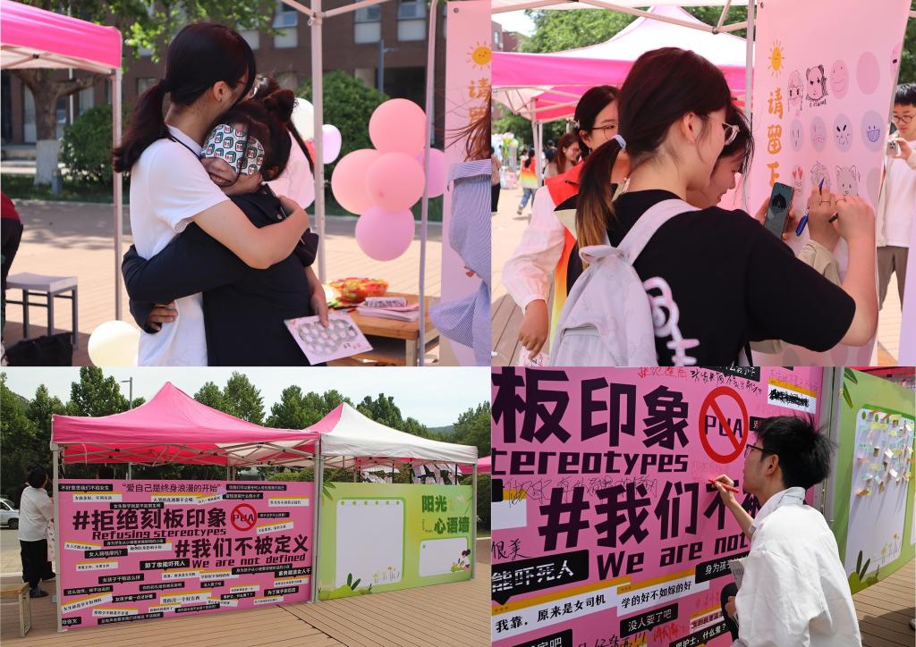 以德育心,以心养德。研究生处开展的“请留下你的微笑”展板绘制活动,用画笔绘制笑脸,用微笑传递美好。“Free Hugs”拥抱活动,收获爱与温暖,感受拥抱的力量。视觉传达设计学院承办的心理健康中心ip形象设计大赛,凝聚创新思维,对心理健康理念进行生动诠释。活动现场组织“阳光心语墙”、“拒绝被定义”游戏体验,在心语墙上抒发心中郁结,在标签墙上涂鸦,鼓励大家不被标签化、不被定义,做自爱、被爱的自己,彰显青春正能量。