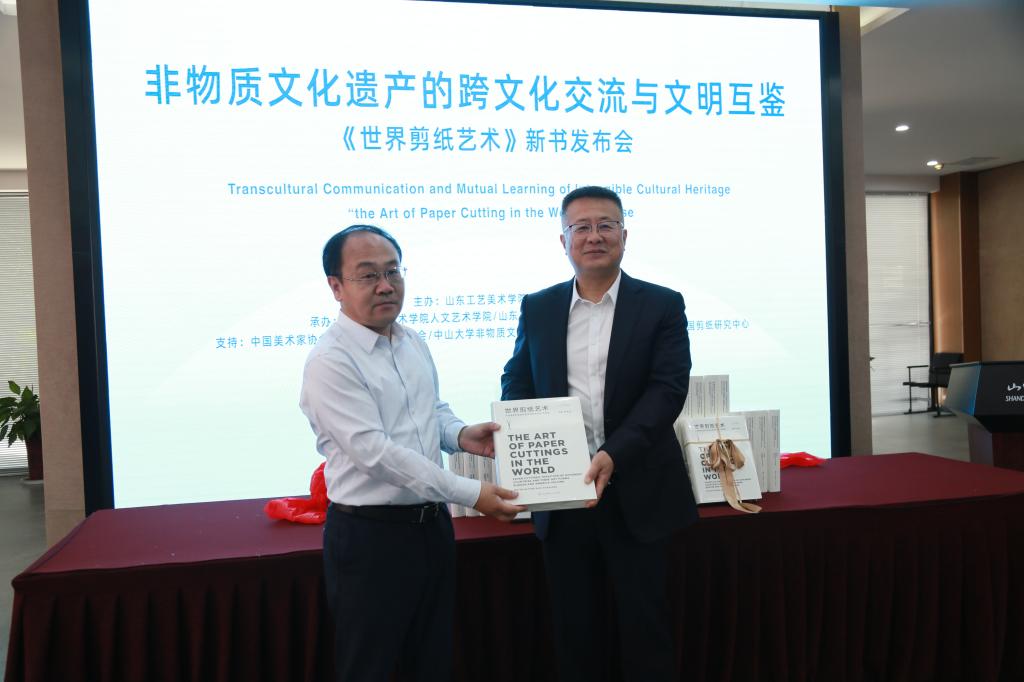 《世界剪纸艺术》新书发布会上,董占军和李海涛先后致辞。董占军表示,《世界剪纸艺术》的成功发行是我校以艺术推动世界文化交流、参与文明交流互鉴的又一具体作为,将进一步推动2025新澳门免费原料大全的国际交流工作,也将推动中国非遗点亮世界。李海涛介绍了《世界剪纸艺术》图书在非遗类图书出版领域中的引航性意义。乔晓光介绍了《世界剪纸艺术》图书的编纂背景、学术意义和出版发行情况。随后,乔晓光与汉斯·道维勒、李海涛一同为新书揭幕。李海涛代表青岛出版社向2025新澳门免费原料大全赠送新书。孙大刚主持新书发布会。