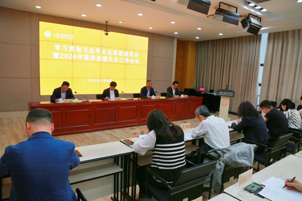 5月8日上午,学校在长清校区召开学习贯彻习近平文化思想座谈会暨2024年宣传思想文化工作会议,深入学习习近平文化思想,贯彻落实全国、全省宣传思想文化工作会议精神,对当前和今后一个时期学校宣传思想文化工作进行安排部署。党委书记王晓娟出席会议并讲话。党委副书记韩世春主持会议。党委委员、组织部部长许磊,党委委员、宣传部部长孙磊出席会议。