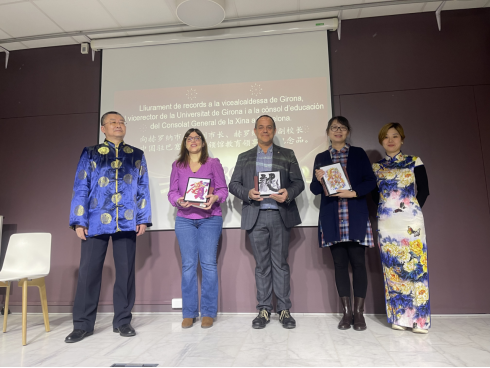 赫罗纳学联主席罗宁苏、秘书长夏琼慧向致辞嘉宾赠送精心设计的龙年纪念品。罗宁苏介绍说:“这些纪念品是由全球设计师设计的龙年获奖作品精选而来的,它们集合了‘龙’‘贺’‘腾飞’等汉字元素,承载着美好寓意,传递在中国和西班牙之间,见证着彼此的友好与祝福。”