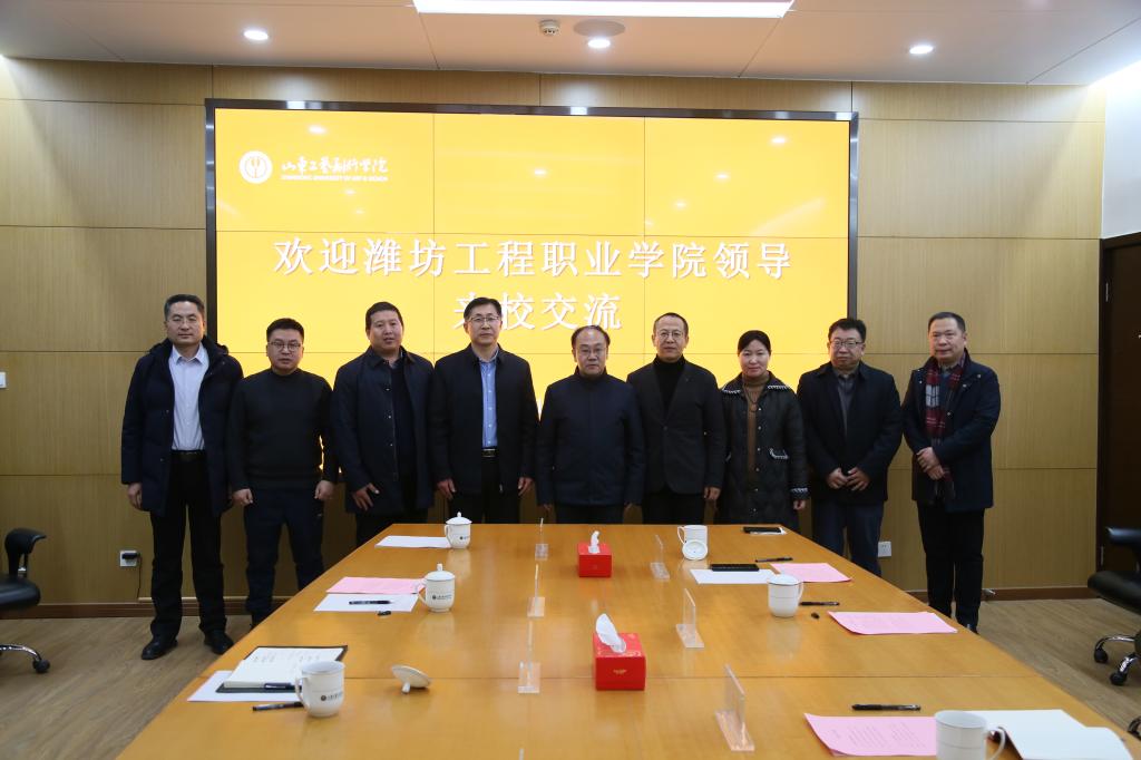 1月10日下午,潍坊工程职业学院党委副书记、院长王忠山,党委委员、副院长赵庆松一行来校交流访问。院长董占军在长清校区会见来宾。
