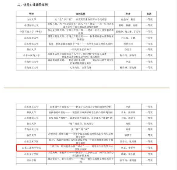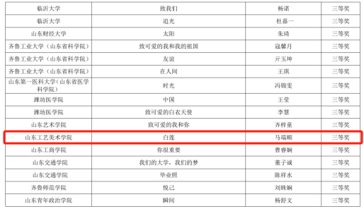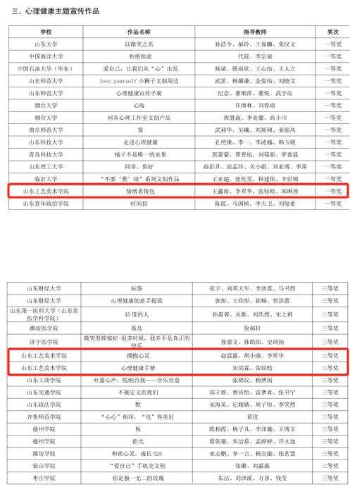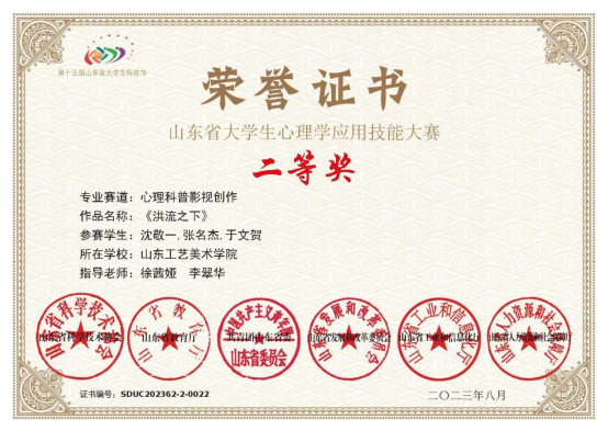 在山东省发展和改革委员会、山东省教育厅、山东省人力资源和社会保障厅等六部门联合举办的山东省大学生心理学应用技能大赛中,我校基础教学部沈敬一、张名杰、于文贺制作的《洪流之下》荣获心理科普影视创作赛道二等奖;应用设计学院杨嘉凝、王月盈等人制作的《手巧心灵》荣获心理科普影视创作赛道三等奖。