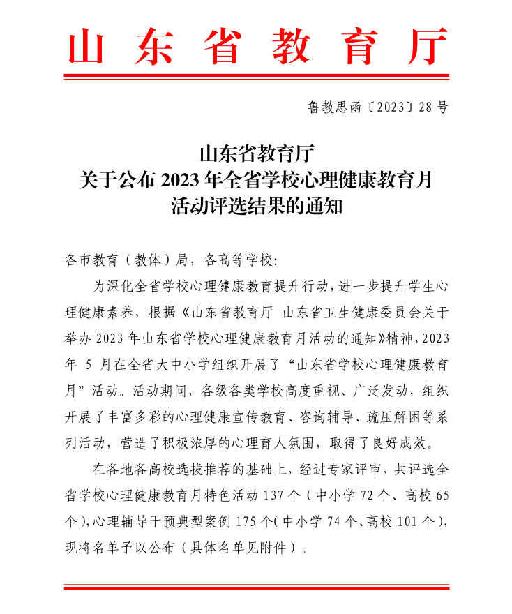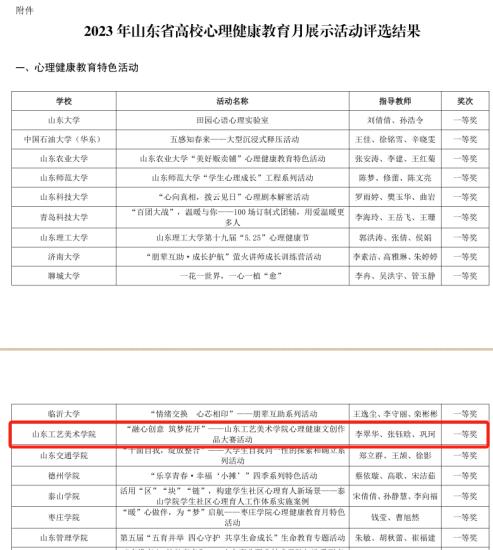 近日,山东省教育厅、山东省高校思想政治教育研究会大学生心理健康教育专委会分别公布了2023年山东省心理健康月系列活动评选结果,我校师生荣获多项奖励。