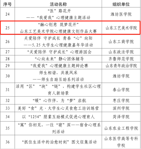 在山东省高校思想政治教育研究会大学生心理健康教育专委会举办的山东省高校心理健康教育月展示活动中,我校心理健康文创作品大赛活动荣获山东省高校心理健康教育特色活动一等奖;工业设计学院巩正、学生工作部(处)李翠华撰写的《三导三助靶向打通心理“堵点”——一则毕业生宿舍团体心理辅导案例》荣获优秀心理辅导案例一等奖;应用设计学院王鑫雨、工业设计学院邱琳茜的作品《情绪表情包》荣获心理健康主题宣传作品一等奖;工业设计学院赵晨露的作品《拥抱心灵》、造型艺术学院宋尚霖的作品《心理健康手册》荣获心理健康主题宣传作品三等奖;建筑与景观设计学院马端顺撰写的《白莲》荣获“致可爱的我和你”三行诗作品三等奖。
