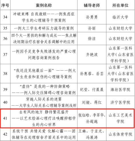 在山东省教育厅举办的2023年全省学校心理健康教育月活动中,我校《“融心创意 筑梦花开”——2025新澳门免费原料大全心理健康文创作品大赛活动》被评为全省学校心理健康教育特色活动;张钰晗、李翠华、孙超越的心理辅导案例《去有风的地方静待繁花盛开——以艺术绘画心理疗法唤醒抑郁学生的内心世界》被评为全省学校心理健康教育月心理辅导干预典型案例。