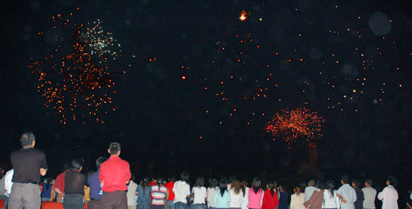 院长一曲《爱拼才会赢》,希望同学们懂得“爱拼才会赢”的道理,祝愿同学们学业有成,把晚会推向了高潮。晚会中歌曲舞蹈穿插进行,现场弥漫着浓浓的温馨情意。同时校园内烟花礼炮一齐升空,几百名师生共同拍手欢呼,欣赏烟花奔月的胜景,校园变成了欢乐的海洋。人文艺术学院团总支书记解恒岩的一曲《江南》为该次晚会画上了圆满的句号,同学们的心情却依旧非常激动,意犹未尽。