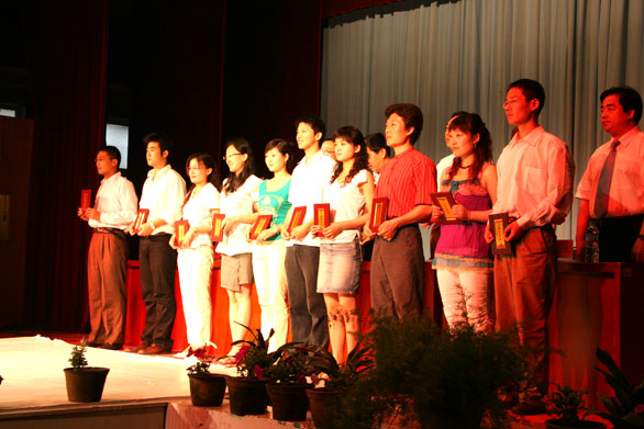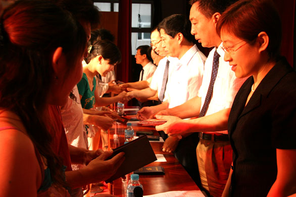 学校领导向优秀毕业生代表颁发了荣誉证书,向毕业生代表颁发了毕业证书。