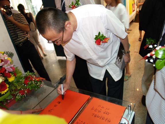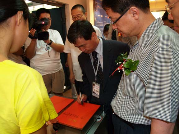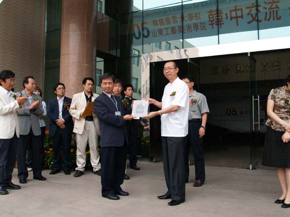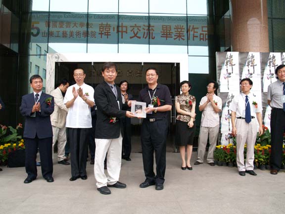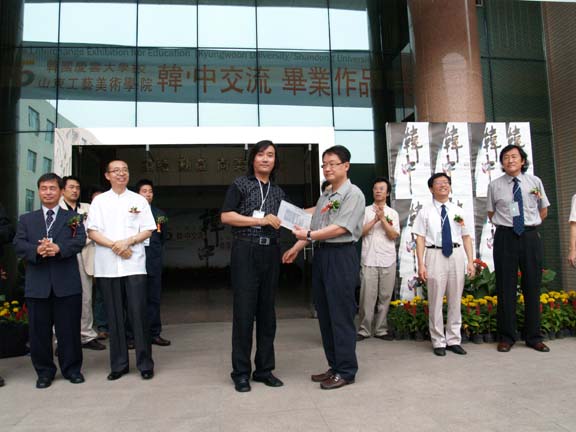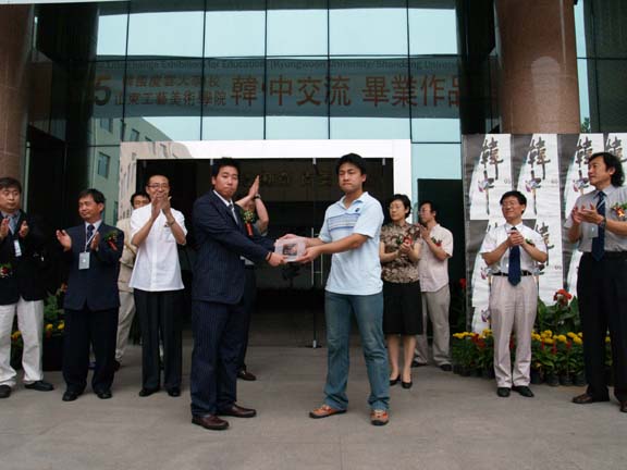 、我院学生代表、平面设计系主任苗登宇和数字艺术系副主任王传东分别向韩国庆云大学的校领导、学生代表及学部教授赠送了纪念牌。随后,两校领导、艺总局长何传乾及曾毅馆长为本次展览剪彩。