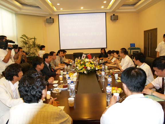 随后,双方校领导、系部、学部教授及学生代表还以座谈会的形式展开了宽泛的交流。座谈会上,我院为韩国朋友播放了山东工艺美院的历史纪录片,其中涵盖了我院的日常教学、各类友情演出、民艺研究所的工作场景、全国十届美展的颁奖实况、招考现场进行时、新校区的规划图以及我院领导出访各国院校的交流纪实。整个纪录片体现了我院融设计与人文、科技、时尚于一体的办学特色。潘院长在发言中强调:“韩国庆云大学与我院共同举办的毕业生作品展,是增进国际间文化交流,推进设计艺术发展的重要举措,也是深化两校合作发展的具体体现。我院自建校以来有30年的发展历史,考虑到中国发展与艺术的相互影响,我院近一步整合了部分专业学科,实现了以艺术学科为主,逐渐向理工科跨越的教学模式。而且,我院会本着‘在国内引进优秀人才,在国外开创多种教学模式’的办学方针,实现艺术设计与国际的接轨。”张周锡副校长也对庆云大学10年来的发展历程、学校目前在韩国的影响以及本校多媒体教学上的优势作了简要介绍。他说:“我校是受当地政府重视和支持的重点院校,并与三星、爱立信等大公司合作办学;虽建校历史短,但却具备有利的开发优势。”