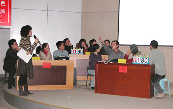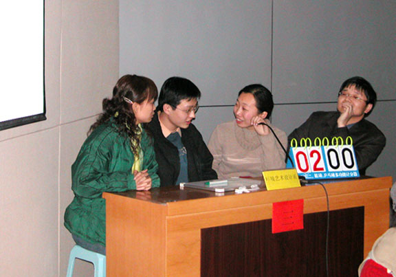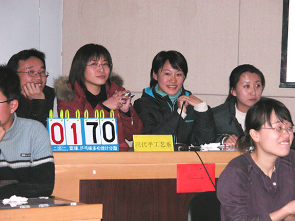 第一轮的小组赛采用了积分淘汰的方式进行,在本轮比赛中,经过紧张的抢答有现代手工艺术系、机关、环艺系、工业系、服装系五支队伍胜出。再接下来的第二轮比赛中,赛场更加激烈,比赛中有的选手沉稳大方,有的选手锐不可当,有的选手老当益壮,可谓八仙过海,各显神通,场下拉拉队也憋足了劲为自己的队伍呐喊助威。