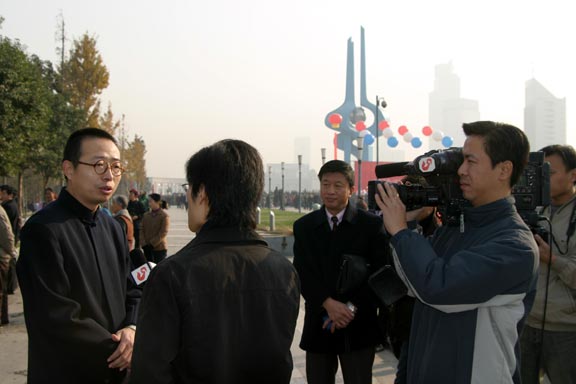 院长在开幕式举行前接受了山东电视台记者的采访,即兴阐述了他对本次“城市红装——法国当代艺术展”的印象和观感。潘院长认为,以“城市红装”为主题的法国当代艺术展,选择在泉城济南举办,其中是有一定文化蕴涵的。济南是有着古老文化底蕴的历史文化名城,向以喷涌的泉水而著称,这座城市的文化既深厚又灵动,既具备固有传统的艺术特色,又积极吸纳外来的新鲜事物。文化艺术对人们的思维、观念以至活动、行为的改变,是无形的,是潜移默化的。法国当代艺术展这样的活动,一定程度上打破了人们在传统意义上对“艺术”概念与作品的理解模式,有助于人们对新鲜艺术样式的接触和接受,有助于提升城市文化品位。