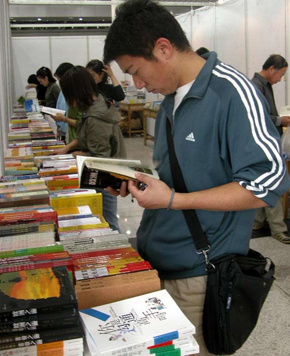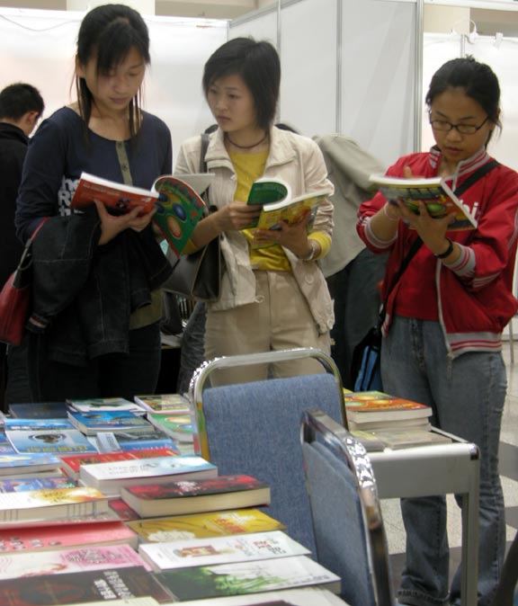 看书展,同学们有的兴致勃勃,有的比较严肃,像虔诚的穆斯林走向神圣的麦加。“凝首激情活力的联欢盛会”、“拓展英姿才华的广阔舞台”、“阅读伴你成长,明天梦想成真”、“Tomorrow publishing house”步入大厅里面满是这种条幅。