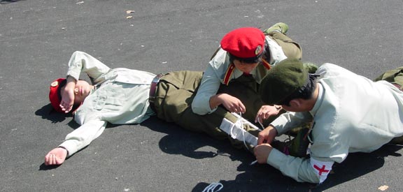 汇报表演的科目为对列、旗语、军体拳、战场救护等。