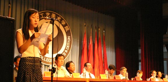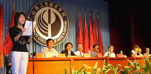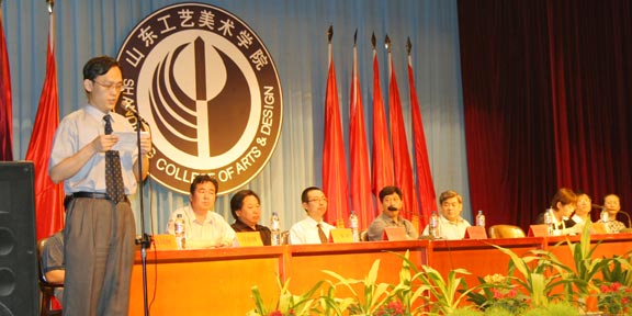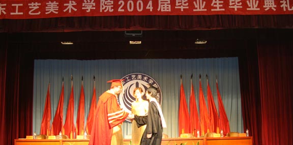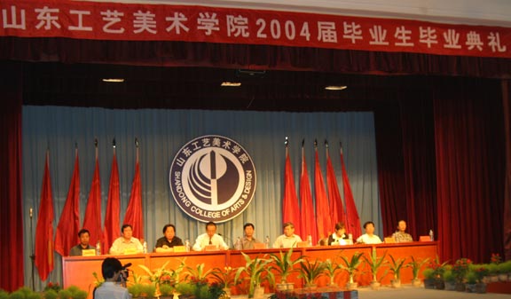 院长充满深情地说, 四年前,我们一起迎接新世纪的曙光;去年,我们一起欢庆学校30年华诞,为长清新校区添上一块砖、种上一棵树;今天,你们即将走出工艺美院,到更广阔的世界里创业开拓……这是一段令人激动的历程。正是在这几年中,你们在千佛山脚下度过了人生最紧张、最美好的大学时光,伴随着学校跨越式前进的步伐,取得了思想与学业上的巨大进步。在此,我代表学校向你们圆满完成学业表示最热烈的祝贺!向指导你们学习、培养你们成长的老师们表示衷心的感谢!