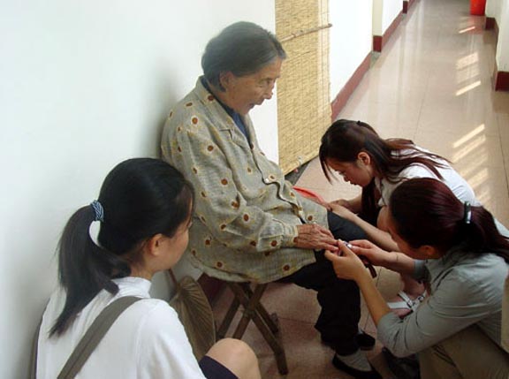 有的同学拿起了笤帚、拖把,认认真真的帮同学们打扫起了卫生,宿舍、走廊、洗手间、桌椅,几乎将每个角落都清扫了一遍;有的同学热情的与老人们拉起了家常,想方设法说一些老人们喜欢聊的话题,逗老人们开心;有的同学拿为老人们削起了水果,让每位老人吃上了适合自己口味的水果;有的同学甚至认真地为老人们剪起了指甲,乐得老人们脸上笑开了花。就连已经76岁一向不爱说话的李树江老人都高兴的说:“今天谢谢工艺美院的同学们的关心,你们又是给我们打扫卫生又是削水果的,我们真是打心底了高兴啊!”。