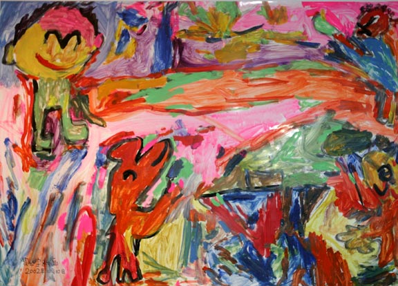 不可否认,贾丛宇小朋友的画极具天赋,他图画中表现的内容与和他同龄的孩子无异,但他使用的图画语言却显示出了强烈的个性。在他的图画中最突出的语言就是色彩语言。有些孩子在作画时偏爱线条造型,不施色,这样的作品在贾丛宇的画作中也有,但似乎不占主导。有些孩子在作画时也善于用色,一般侧重颜色的平涂。但像贾丛宇这样从小就使用炳烯颜料创造丰富的色彩语言的却不多见。他的图画完全抛弃了物象的固有,遵从主观用色,大胆选择对比色,直接用红、绿、黄、橙、蓝色并置,无“规矩”,无“定式”,凭着幻想的审美直觉,在画面上挥洒出了强烈的运动感与冲击力,让人感受到了来自这个孩子内心的激情和他的创造力与爆发力。这是一个孩子的画,所以我们感受到的不是理性与科学审慎的色彩观,而是他的色彩直觉,这是内心性格的一种天真语言的反射。贾丛宇可能有时觉得画笔已无力所逮,他甚至直接用手指沾着颜料在画面上涂抹。笔者不是儿童教育专家,但知觉告诉我,儿童的图画与他特定的发育期有着密切的关系,他们图画的语言是理想的梦,童话的诗,幻想的创造。笔者也一直认为儿童的图画并非我们今天所说的“艺术”,起码不是成人的艺术类型。他们的图画语言是我们成年人很难明白的天真世界,也是现代艺术所追求的“真”的境界。或许画画本身还含有游戏性?用手指涂画和用画笔绘画带给他内心的体验显然是不同的,但对其画面所留痕迹抑或是笔触的任何所谓形式化的解读显然是一种简单化的曲解。但不管怎么说,贾丛宇小朋友的图画掀开了我们对现代艺术大师的那一页记忆。另外,贾丛宇的画也充满了想象,在他的画中,我们没有看到程式化的“创作”,他的观察力与概括力都非常强,在他所接触的这个有限的空间与时间中,他准确、有力地捕捉到了活跃在他视界与思维中的各种物象,并且赋予了自信与亲情。在他的图画中,无论是妈妈、小朋友、自己,还是天上的飞鸟、水边的鳄鱼、与塘荷相伴的青蛙、林中的老虎、孤独的大灰狼,还是恐龙世界,作为观者,我们都能感受到孩子对自然的亲近与对其中奥秘进行探求的渴望。这是他生活世界的直接反映。