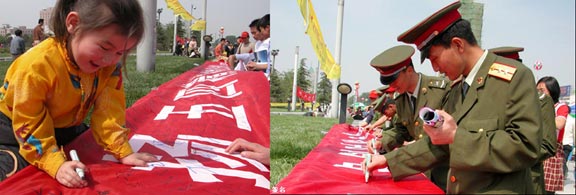 除了咨询活动外,设计先锋问卷调查和“弘扬五四精神,争创青年先锋”签名活动在泉城广场同步进行。在签名现场,上至八十岁的老人下至四岁的小朋友,其中有市民、儿童、军人、记者等纷纷在条幅上签下了自己的一份责任。两项活动同样收到了积极的效果。