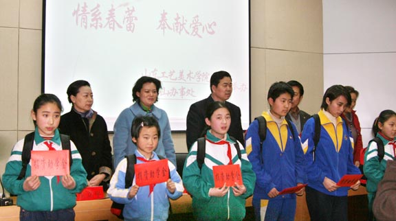 山东工艺美院教职工为6名贫困女童捐款共计3775元。其中包括为她们每人捐助的300元学费和近100元的文具。学院还为这些受助女童建立了信息卡,以便及时了解她们的学习情况,将来继续给予适当捐助。