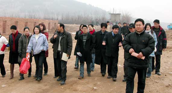 慰问团带去了全院师生签名的条幅——“你们是最可爱的人,向奋斗在新校区建设一线的老师们致敬”,并且准备了精彩的相声、小品、诗歌朗诵等文艺节目。时近中午,慰问团到达长清校区施工现场,慰问团的到来使在场的每一位工作人员感动不已,他们热情地带领一行师生参观了主教学楼、餐厅、学生公寓等主建筑的施工情况,王秀存副院长兴致勃勃地就新校区进展情况及未来发展全貌为大家进行了讲解。他说,虽然目前施工现场条件非常艰苦,但我们的工作人员一定会全力以赴,保质保量地圆满完成一期工程,将一个全新的工艺美院展现给全院师生。随后,大家登上了长清校区所依傍的主峰,鸟瞰新校区全貌,心潮澎湃,激动万千。