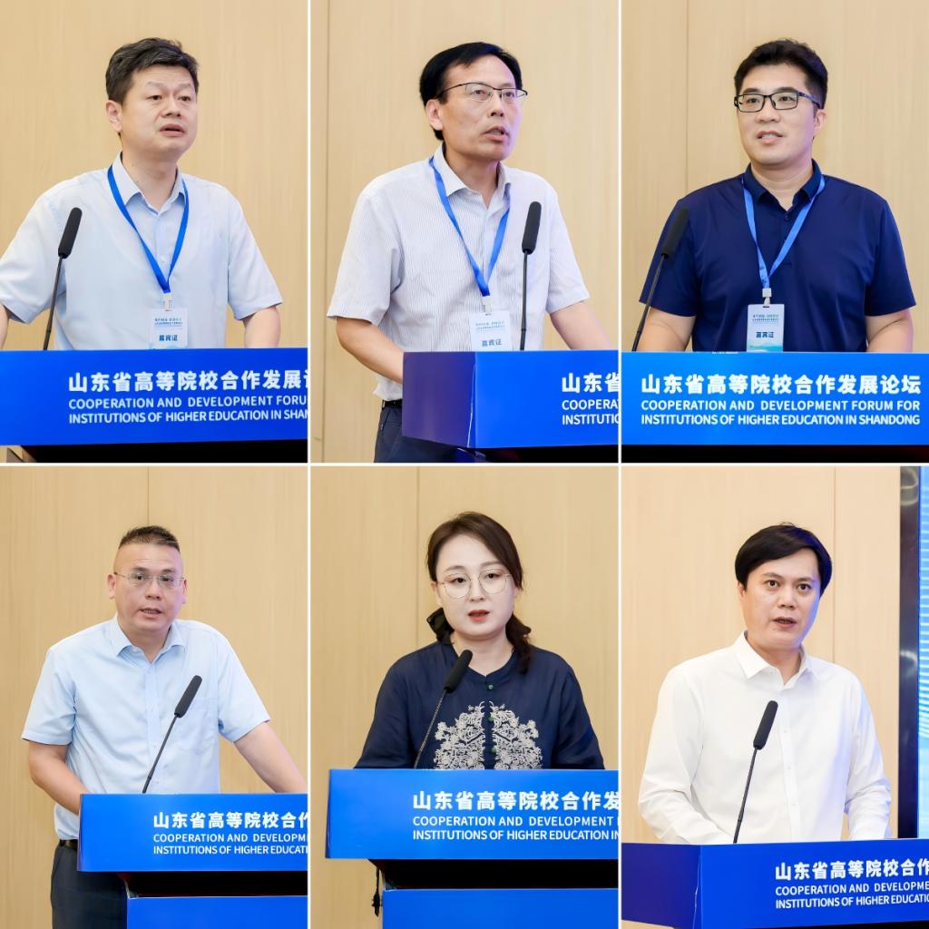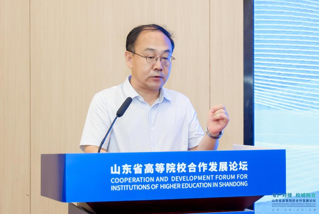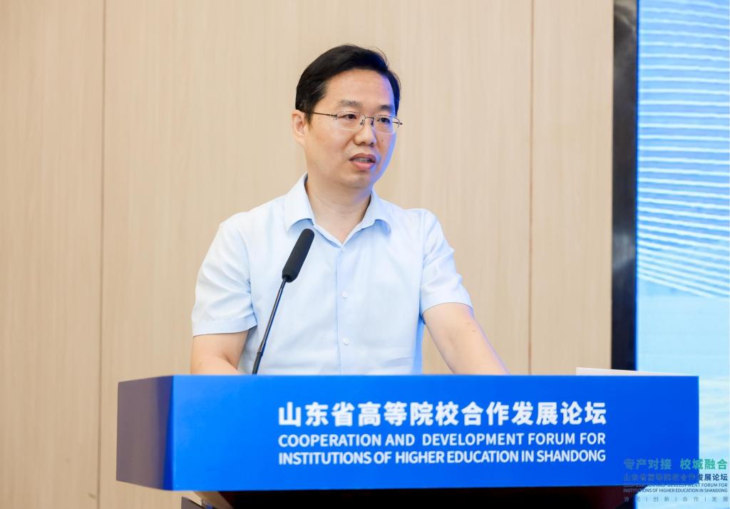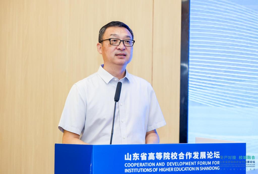 赵明代表山东省工业和信息化厅致辞。他认为,本次论坛以“专产对接 校城融合”为主题,是一次成功的尝试,是一个全新的起点,必将对山东省“产学研融通创新”产生重要影响。他希望,通过本次论坛能够搭建校政、校企、校校“综合枢纽”平台,畅通产教融合渠道;能够推进学科专业供给侧改革,构建人才共育体系;能够创新突破体制机制局限,释放协同创新活力,共同绘就校城共生、产教共荣的新图景,为新时代现代化强省建设作出更大贡献。