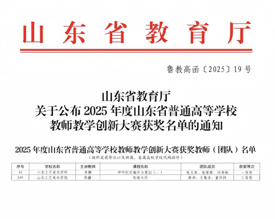 近日,山东省教育厅公布2025年度普通高校教师教学创新大赛获奖名单。我校教师表现优异,取得参赛以来最好成绩:数字艺术与传媒学院李娜老师(团队)荣获新文科副高组一等奖,应用设计学院陈静老师(团队)获得新文科中级及以下组三等奖。