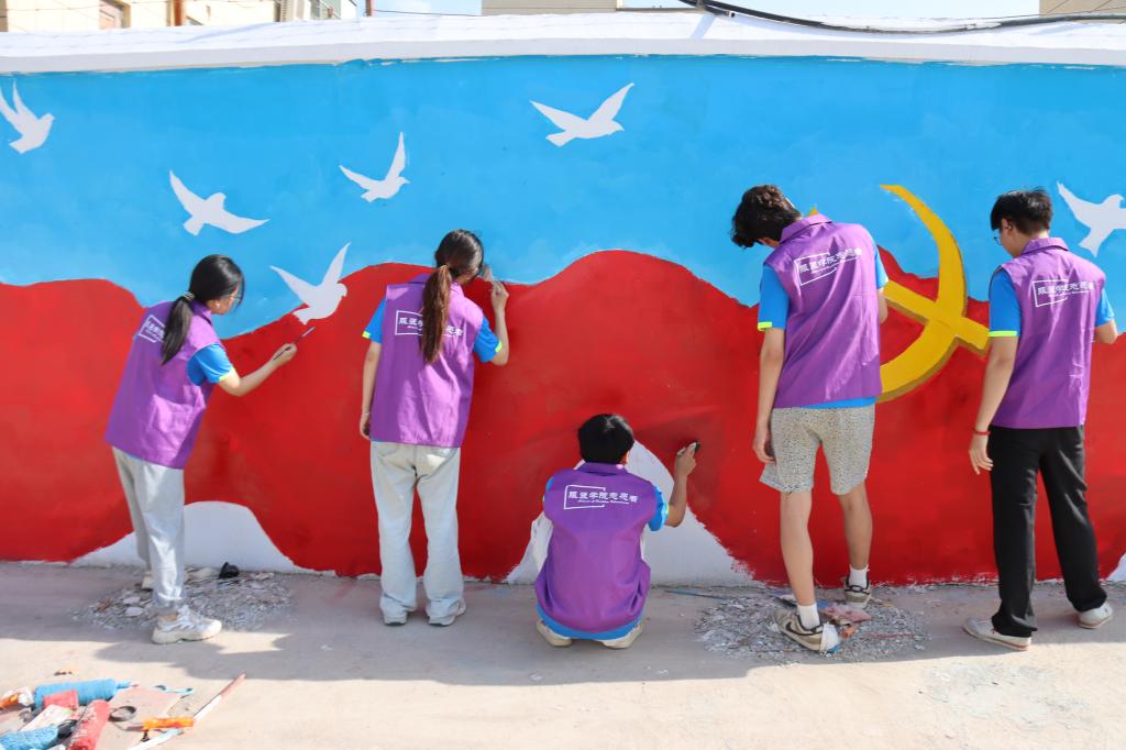 支教期间,实践团深入喀什岳普湖县团结社区,在社区夜市开展了一场别开生面的“童心向党·民族团结”主题墙绘活动,用艺术语言搭建民族情感共鸣的桥梁。团队精心设计两大核心创作内容:一侧墙面绘制“童心手印树”——志愿者和社区儿童用手蘸取颜料,在墙面的“大树”轮廓上按下专属手印,每一个稚嫩的手印化作“树叶”,最终汇聚成枝繁叶茂的“同心树”。另一侧墙面则创作爱国爱党主题图样,志愿者以简洁有力的线条勾勒出五星红旗、党徽、和平鸽等元素,传递“民族团结一家亲、同心共筑中国梦”的家国情怀。
