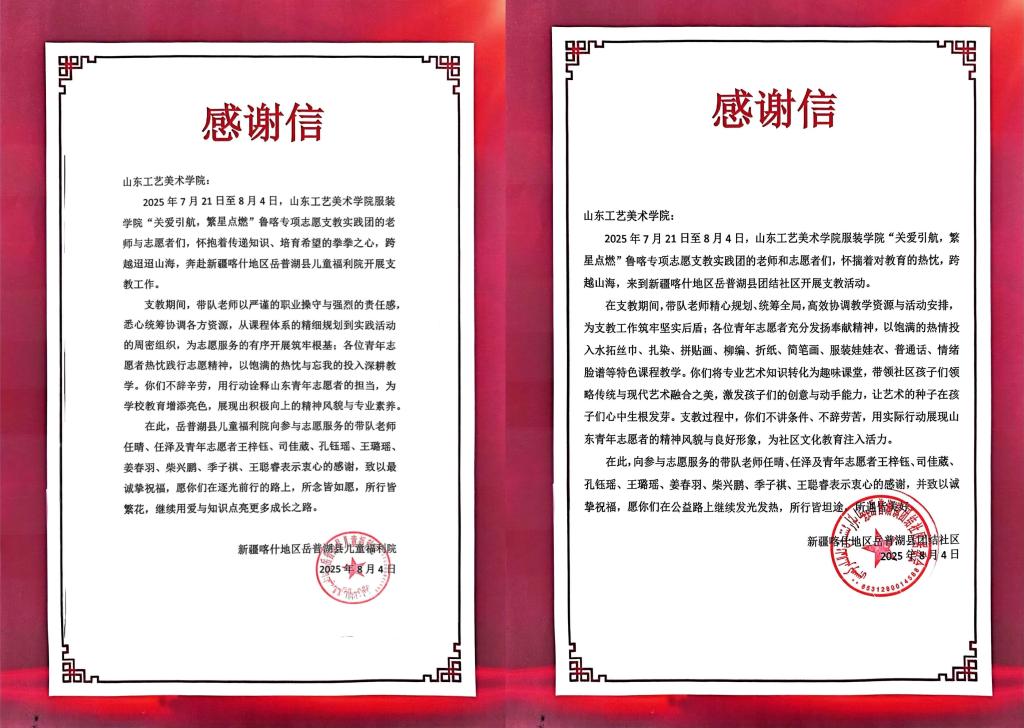 此次鲁喀专项支教活动,以扎实的实践成效赢得当地多方认可与赞誉。离别之际,喀什岳普湖县团结社区和希望学校向实践团送上感谢信和锦旗,字里行间满是对志愿者“用艺术点亮童心、以真情温暖社区”的感激,旗帜上金色的字迹见证着师生们的朝夕相伴与共同成长。支教期间,当地居民更是用实际行动给予支持,点点滴滴的善意,成为鲁喀情谊最生动的注脚。
