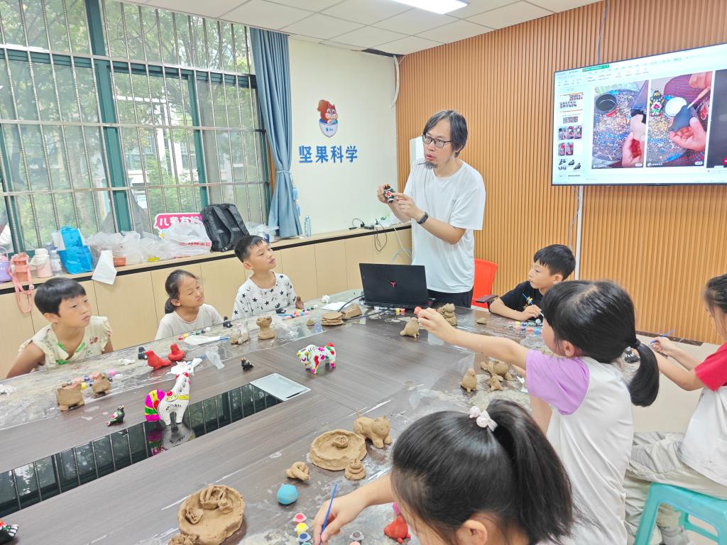 在潍坊市,造型艺术学院的曹淑海老师从“土里捏出的千年智慧”切入,为学员们细数彩塑技艺中的传统讲究,他首先向学员们展示了精美的彩塑作品,栩栩如生的造型和鲜艳明快的色彩立刻吸引了所有孩子的目光。随后,在曹老师耐心细致的指导下,孩子们化身“手艺人”,用灵巧的小手揉捏着陶泥,从最简单的几何形状开始,慢慢塑造出各种生动形象。有的孩子捏出了可爱的小动物,有的则尝试塑造传统人物,当一个个惟妙惟肖的彩塑作品从学员手中诞生,尤其是小朋友们捧着自己的作品露出笑容时,传统文化的种子也在课堂中悄然发芽。“这堂课我收获满满,深刻地感受到了中国传统文化的博大精深。”学生刘希瞳说道。