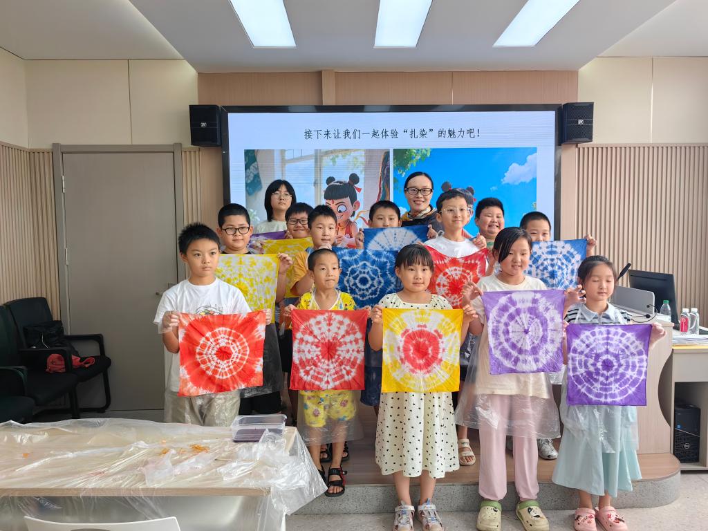 在烟台市,视觉传达设计学院的谭晓宁老师将扎染这门古老的手工艺课程变成了充满欢声笑语的创意工坊。示范环节中,谭老师手持素白棉布,指尖翻飞间,棉线在布料上勾勒出精巧的纹样。“扎结的松紧决定图案的疏密,染料的浓淡影响色彩的层次。”她一边讲解要领,一边指导学生们动手实践。教室里顿时热闹起来,孩子们配合默契,有的负责捆扎,有的调制染料,共同沉浸在创作的乐趣中。当一个个线团被小心翼翼地拆开时,教室里爆发出阵阵惊叹。原本素白的布料上,绽放出如云似雾的靛蓝花纹,每一幅作品都独一无二,仿佛在诉说着不同的故事。孩子们捧着各自的作品,脸上洋溢着发现新大陆般的惊喜;家长们则用手机记录下这难忘的瞬间。
