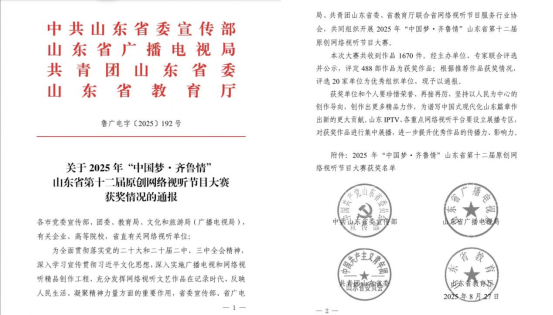 近日,2025年“中国梦·齐鲁情”山东省第十二届原创网络视听节目大赛获奖情况正式公布,我校凭借卓越的创作实力与组织能力,斩获二等奖一项、三等奖一项,学校获评优秀组织单位。