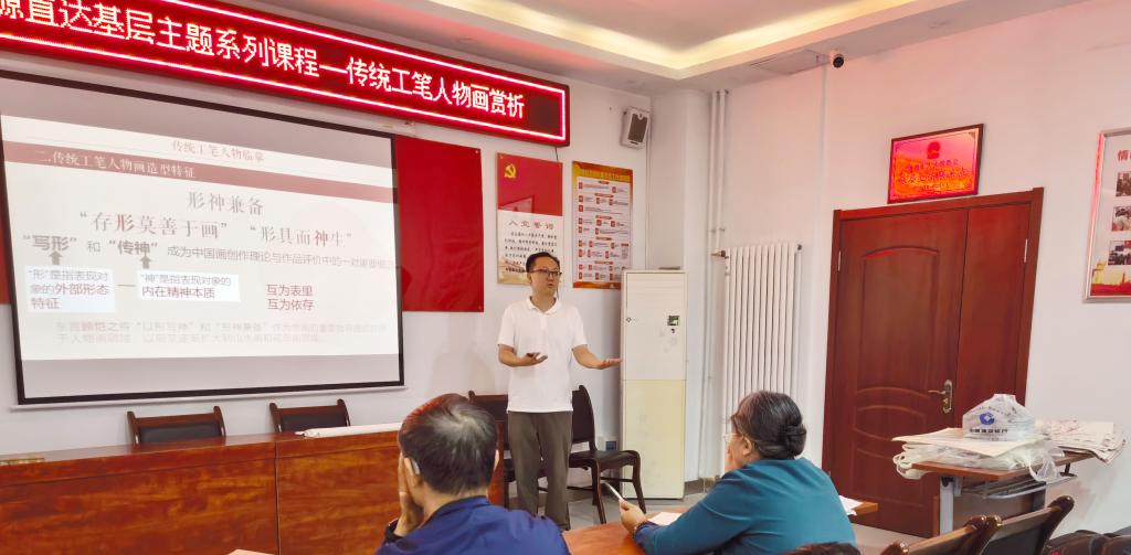 在德州,一场雅致的传统美学之旅悄然开启。造型艺术学院张树轩老师带来的《传统工笔人物画赏析》课程,让社区居民沉浸式走进传统工笔人物画的细腻世界。张老师先是以《簪花仕女图》《历代帝王图》等作品为例,细细拆解画中人物的衣袂纹理、神情姿态——如何勾勒出轻盈飘逸的裙摆,如何以淡彩晕染展现人物的温婉气质,都被他讲解得清晰透彻。随后,他还现场示范了工笔人物画的基础勾线技巧,笔尖在宣纸上缓缓游走,一个个灵动的人物轮廓渐渐成形。居民们屏息凝神,时而点头赞叹,时而认真记录,在对工笔艺术的细细品味中,感受传统美学的独特魅力。